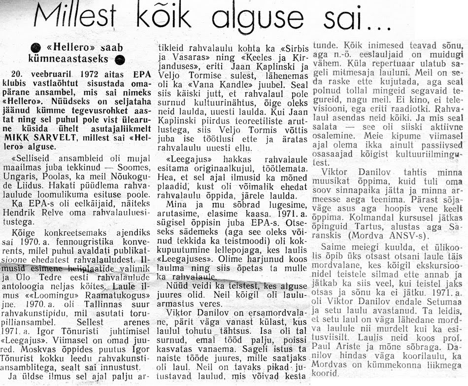 [muuda | muuda lähteteksti]- J. Vendelin, FOTIS: EPA üliõpilasklubi rahvalauluansambel "Hellero". 1974